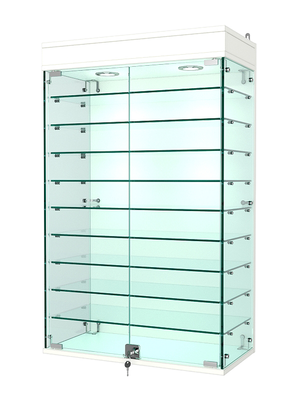 Данная модель включает девять стеклянных полок и распашные дверки, закрывающиеся на ключ. Верхняя подсветка делает витрину ярче, а ее содержимое — заметнее.
