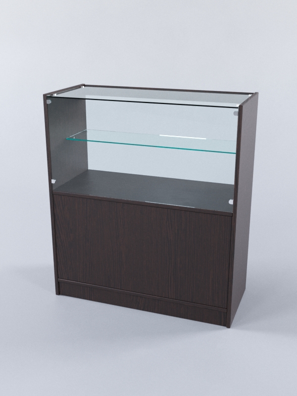 Прилавок «Тандем Мини» №3 с остекленной верхней половиной предназначен для магазинов различного профиля. Изготовлен из ЛДСП 16мм с кромкой ПВХ. Фасадное и горизонтальное стекло толщиной 5мм с полировкой держится на хромированных держателях с винтовыми зажимами. В комплект прилавка входит стеклянная полка. Со стороны продавца прилавок открыт.