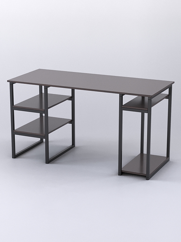 Стол состоит из столешницы, двух одинаковых по размеру полок слева, двух разногабаритных справа и прочного металлического каркаса.