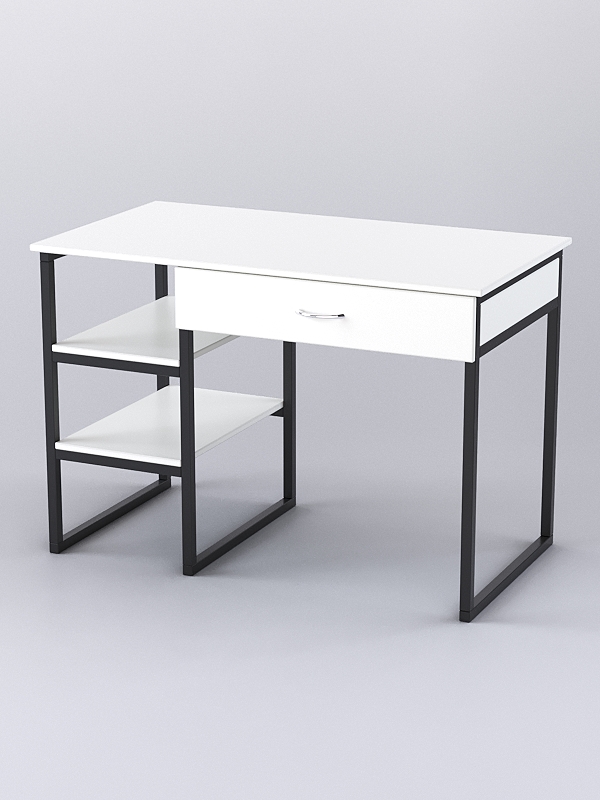 Стол состоит из столешницы, двух полок и прочного металлического каркаса.