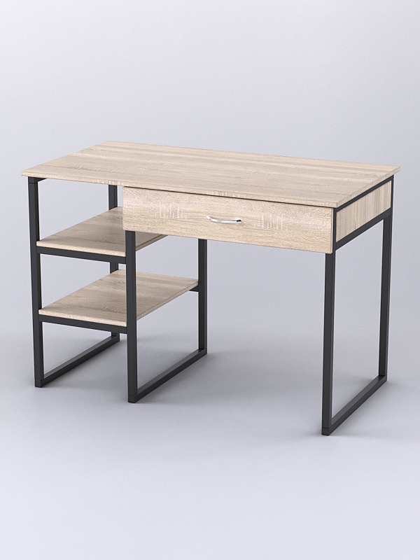 Стол состоит из столешницы, двух полок и прочного металлического каркаса.