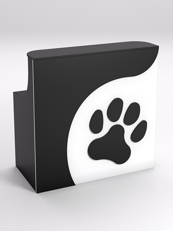 Невысокая стойка администратора, украшенная отпечатком лапы кошки, с первых минут пребывания в компании покажет вашим посетителям то, что забота о животных — главный приоритет вашей организации.