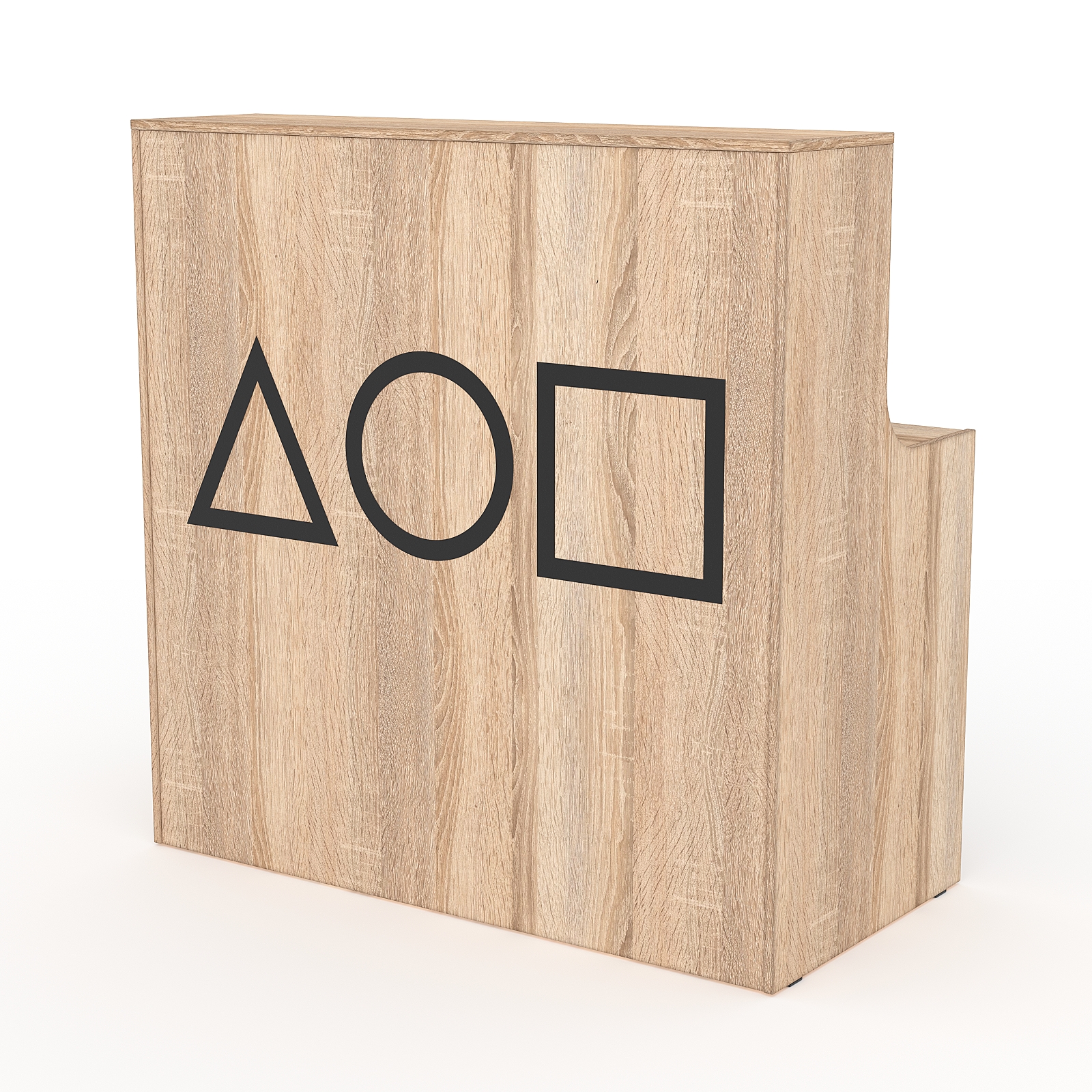 Каркас, столешница и цоколь выполнены из ДСП. Форма стойки прямоугольная. Внутренняя сторона оборудована рабочим столом.