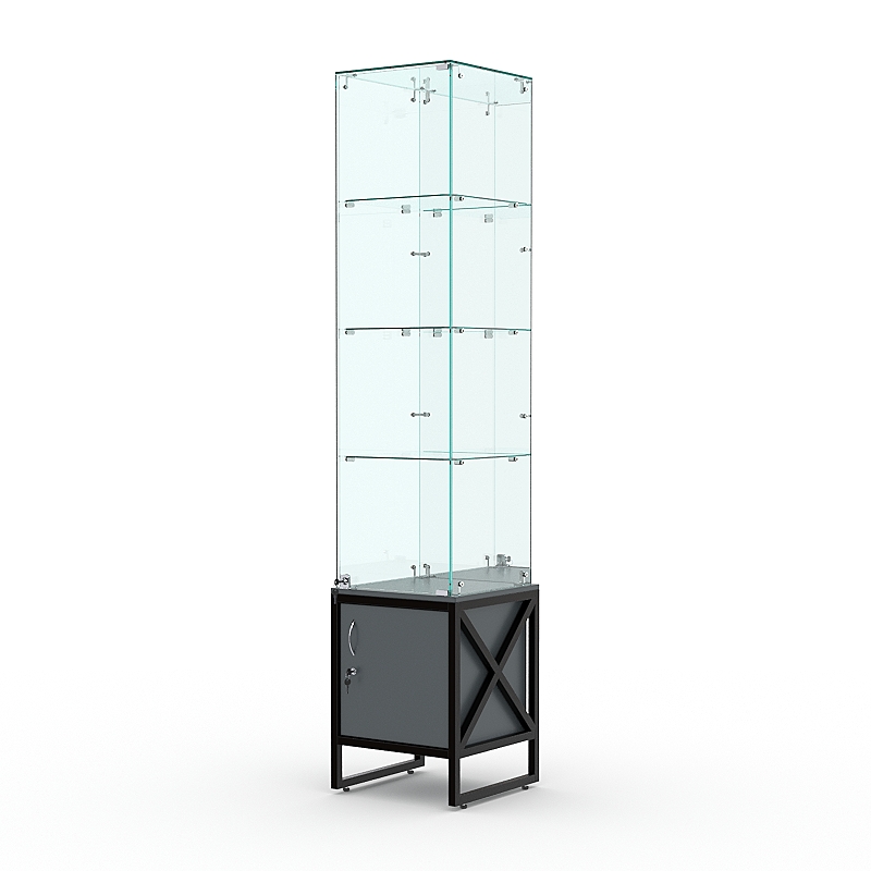 Витрина стеклянная «ЛОФТ СТИЛЬ» №8 (с дверкой, задняя стенка — зеркало) украсит интерьер любого канцелярского, книжного, художественного или парфюмерного магазина. Также она хорошо дополнит магазин одежды и обуви, ведь на ее полках поместится множество аксессуаров.