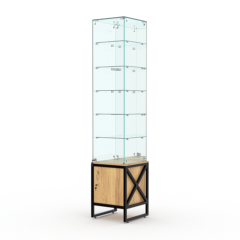 Витрина стеклянная «ЛОФТ СТИЛЬ» №508 (с дверкой, задняя стенка — зеркало) украсит интерьер любого канцелярского, книжного, художественного или парфюмерного магазина. Также она хорошо дополнит магазин одежды и обуви, ведь на ее полках поместится множество аксессуаров.