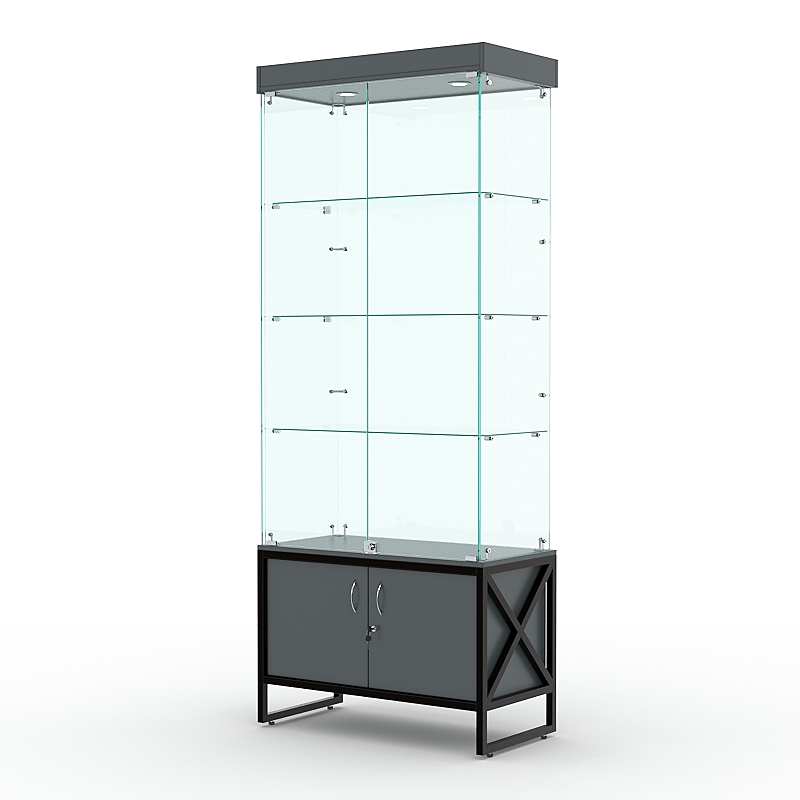 Витрина стеклянная «ЛОФТ СТИЛЬ» №1 (с дверками, задняя стенка — стекло) украсит интерьер любого канцелярского, книжного, художественного или парфюмерного магазина. Также она хорошо дополнит магазин одежды и обуви, ведь на ее полках поместится множество аксессуаров.