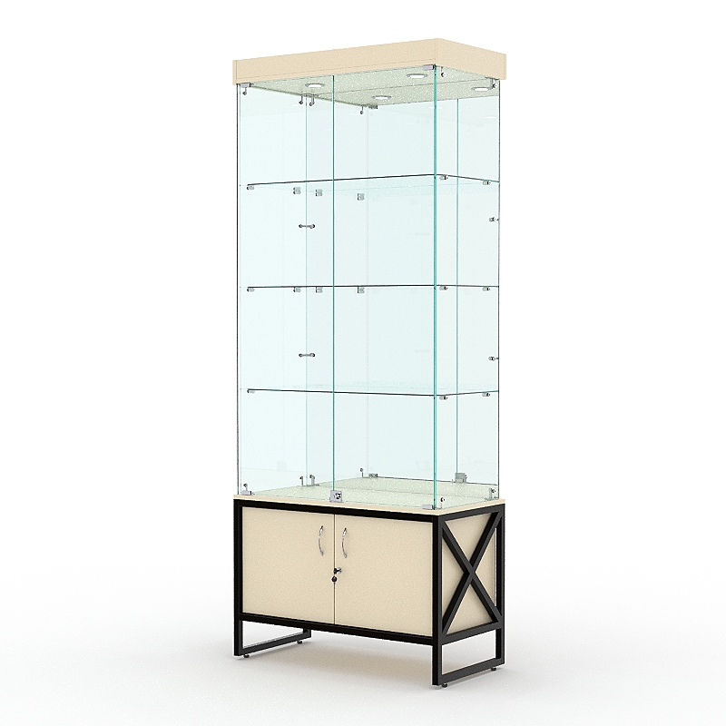 Витрина стеклянная «ЛОФТ СТИЛЬ» №3 (с дверками, задняя стенка — зеркало) украсит интерьер любого канцелярского, книжного, художественного или парфюмерного магазина. Также она хорошо дополнит магазин одежды и обуви, ведь на ее полках поместится множество аксессуаров.