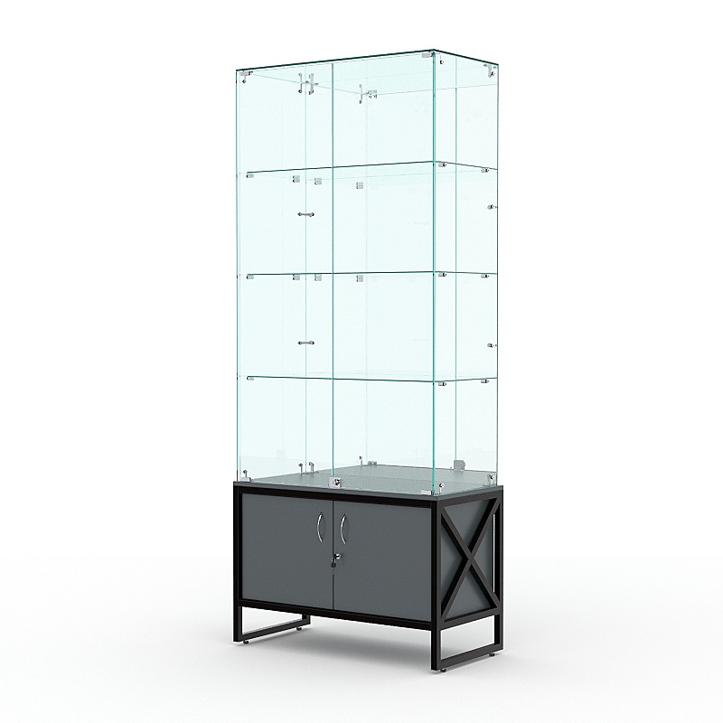 Витрина стеклянная «ЛОФТ СТИЛЬ» №7 (с дверками, задняя стенка — зеркало) украсит интерьер любого канцелярского, книжного, художественного или парфюмерного магазина. Также она хорошо дополнит магазин одежды и обуви, ведь на ее полках поместится множество аксессуаров.