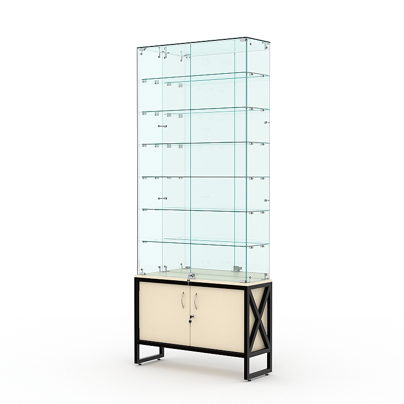 Витрина стеклянная «ЛОФТ СТИЛЬ» №34 (с дверками, задняя стенка — зеркало) украсит интерьер любого канцелярского, книжного, художественного или парфюмерного магазина. Также она хорошо дополнит магазин одежды и обуви, ведь на ее полках поместится множество аксессуаров.