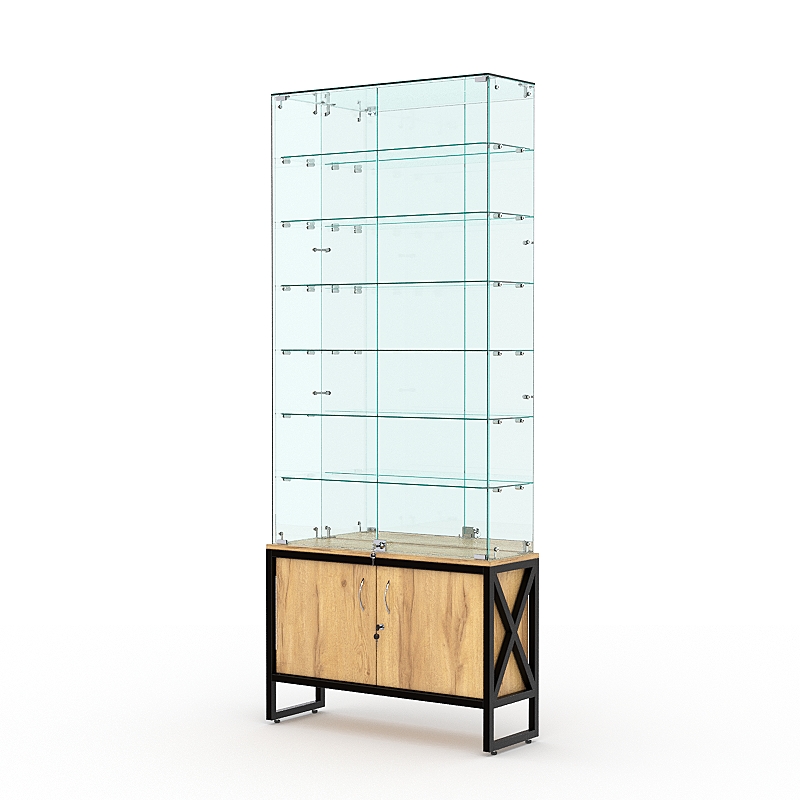 Витрина стеклянная «ЛОФТ СТИЛЬ» №34 (с дверками, задняя стенка — зеркало) украсит интерьер любого канцелярского, книжного, художественного или парфюмерного магазина. Также она хорошо дополнит магазин одежды и обуви, ведь на ее полках поместится множество аксессуаров.