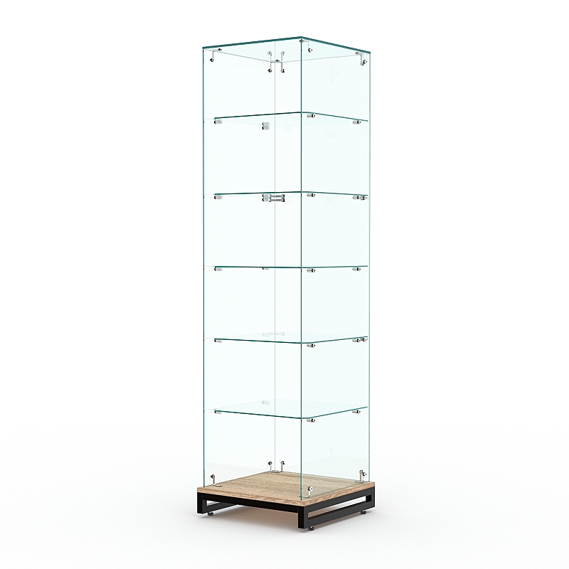 Стеклянная витрина без дверки на металлическом основании из сварной профильной трубы 25х25мм, покрытой порошковой краской украсит интерьер книжного, художественного, парфюмерного магазина.