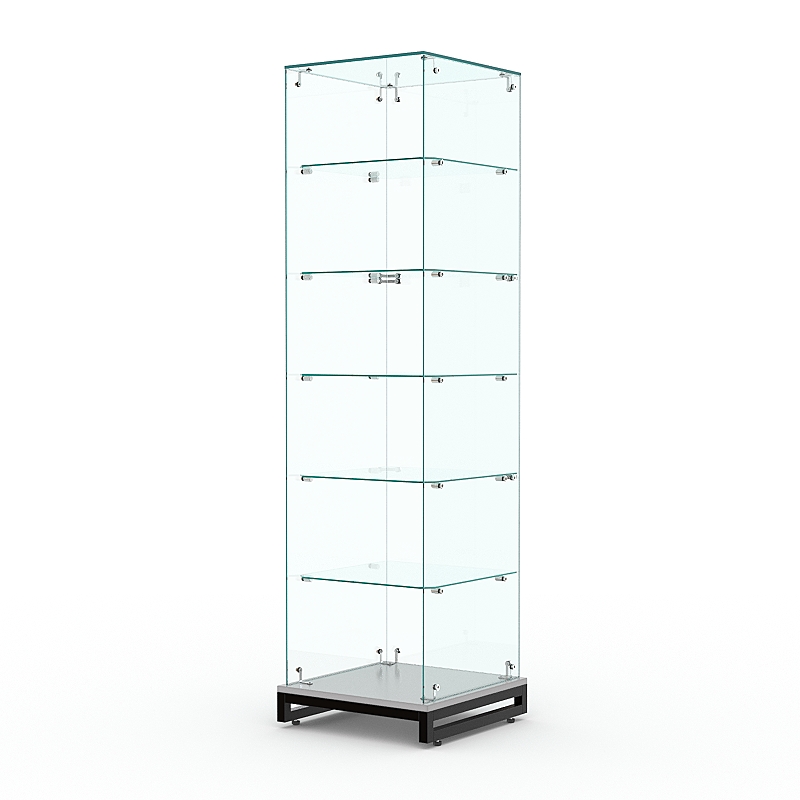 Стеклянная витрина без дверки на металлическом основании из сварной профильной трубы 25х25мм, покрытой порошковой краской украсит интерьер книжного, художественного, парфюмерного магазина.