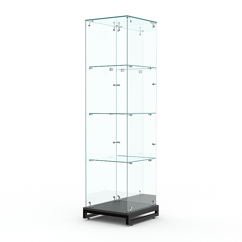 Стеклянная витрина без дверки на металлическом основании из сварной профильной трубы 25х25мм, покрытой порошковой краской украсит интерьер книжного, художественного, парфюмерного магазина.