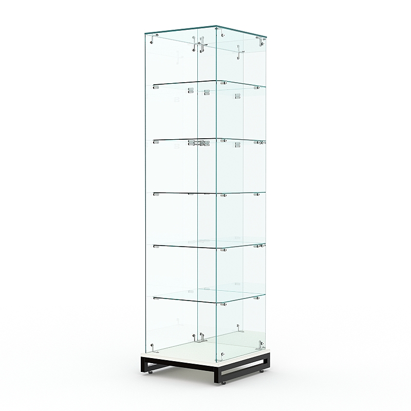 Стеклянная витрина без дверки на металлическом основании из сварной профильной трубы 25х25мм, покрытой порошковой краской украсит интерьер книжного, художественного, парфюмерного магазина.