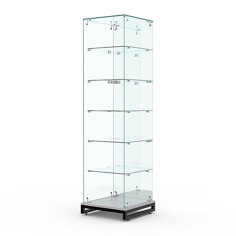 Стеклянная витрина без дверки на металлическом основании из сварной профильной трубы 25х25мм, покрытой порошковой краской украсит интерьер книжного, художественного, парфюмерного магазина.