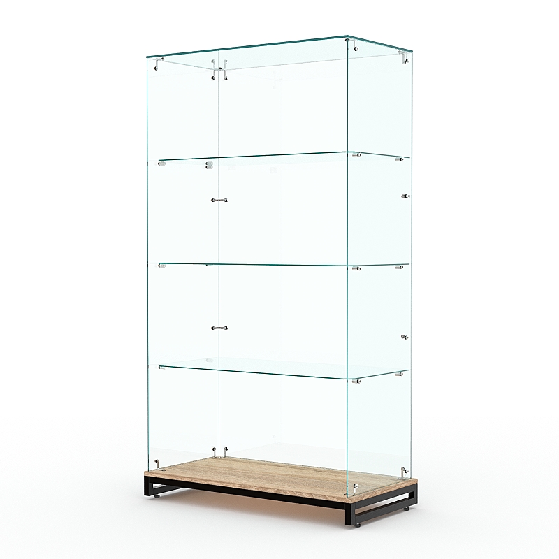 Стеклянная витрина без дверки на металлическом основании из сварной профильной трубы 25х25мм, покрытой порошковой краской украсит интерьер книжного, художественного, парфюмерного магазина.
