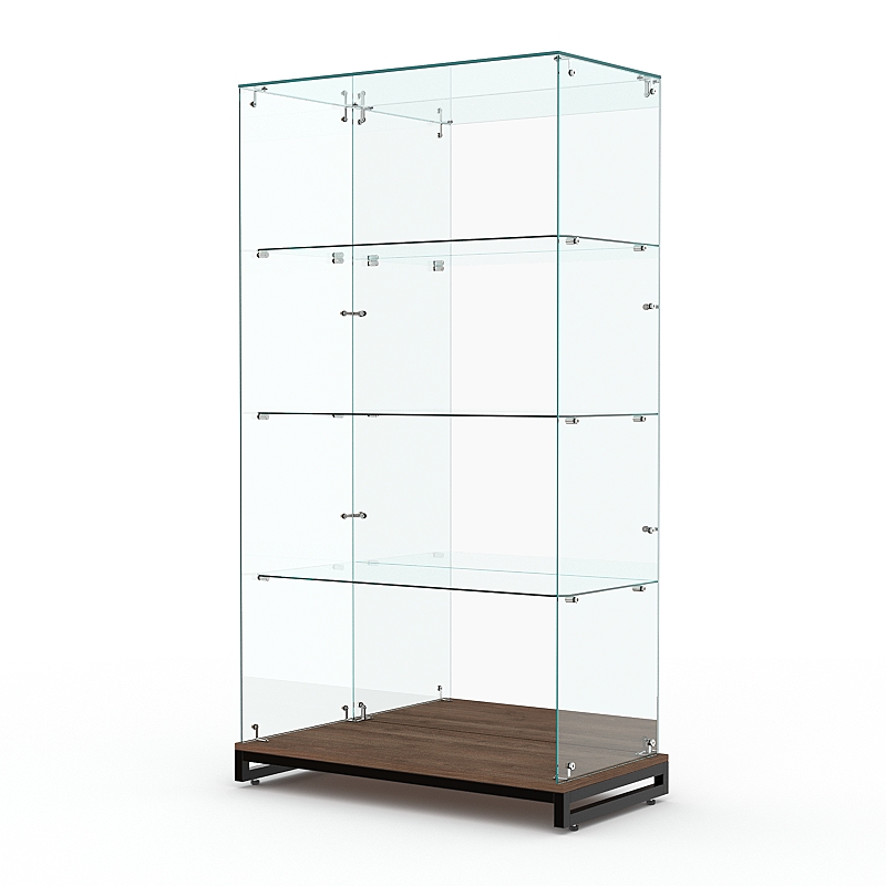 Стеклянная витрина без дверки на металлическом основании из сварной профильной трубы 25х25мм, покрытой порошковой краской украсит интерьер книжного, художественного, парфюмерного магазина.