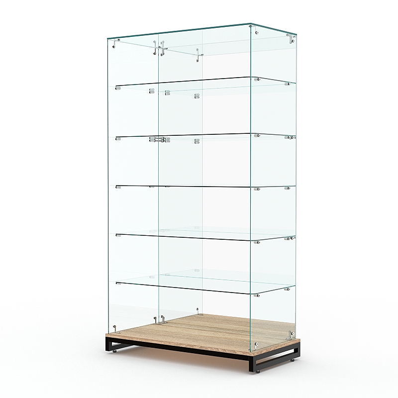 Стеклянная витрина без дверки на металлическом основании из сварной профильной трубы 25х25мм, покрытой порошковой краской украсит интерьер книжного, художественного, парфюмерного магазина.