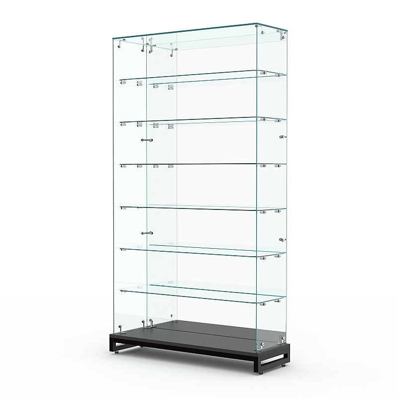 Стеклянная витрина без дверки на металлическом основании из сварной профильной трубы 25х25мм, покрытой порошковой краской украсит интерьер книжного, художественного, парфюмерного магазина.