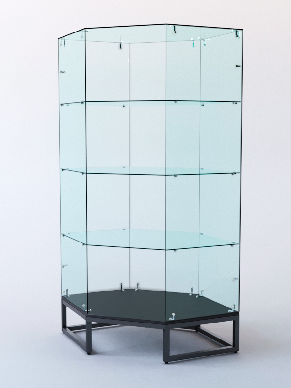 Стеклянная шестигранная витрина на металлическом основании из сварной профильной трубы 25х25мм, покрытой порошковой краской украсит интерьер книжного, художественного, парфюмерного магазина.