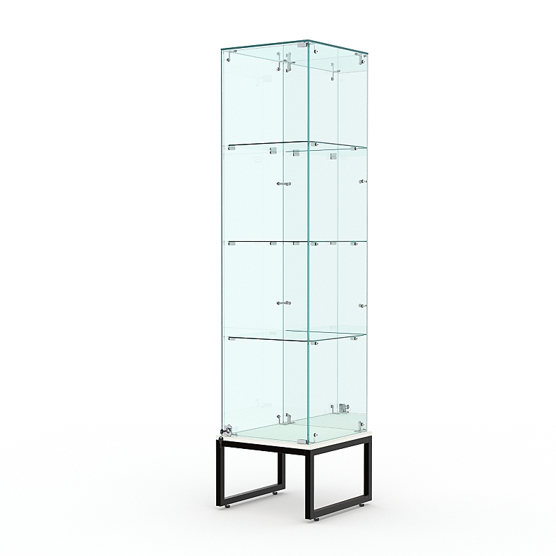 Торговая стеклянная витрина на металлическом основании из сварной профильной трубы 25х25мм, покрытой порошковой краской украсит интерьер книжного, художественного, парфюмерного магазина.
