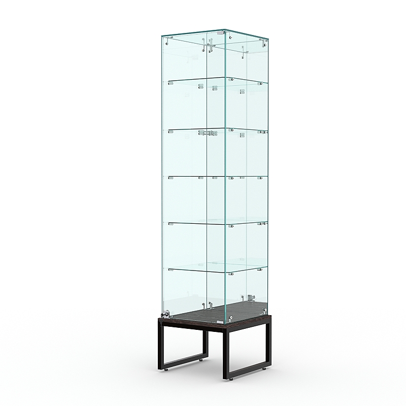Торговая стеклянная витрина на металлическом основании из сварной профильной трубы 25х25мм, покрытой порошковой краской украсит интерьер книжного, художественного, парфюмерного магазина.
