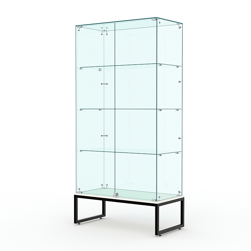 Торговая стеклянная витрина на металлическом основании из сварной профильной трубы 25х25мм, покрытой порошковой краской украсит интерьер книжного, художественного, парфюмерного магазина.