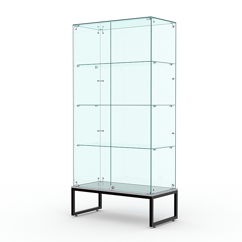 Торговая стеклянная витрина на металлическом основании из сварной профильной трубы 25х25мм, покрытой порошковой краской украсит интерьер книжного, художественного, парфюмерного магазина.
