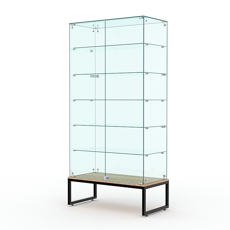 Торговая стеклянная витрина на металлическом основании из сварной профильной трубы 25х25мм, покрытой порошковой краской украсит интерьер книжного, художественного, парфюмерного магазина.