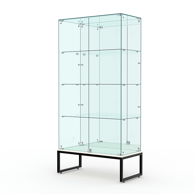 Торговая стеклянная витрина на металлическом основании из сварной профильной трубы 25х25мм, покрытой порошковой краской украсит интерьер книжного, художественного, парфюмерного магазина.