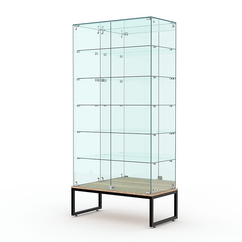 Торговая стеклянная витрина на металлическом основании из сварной профильной трубы 25х25мм, покрытой порошковой краской украсит интерьер книжного, художественного, парфюмерного магазина.