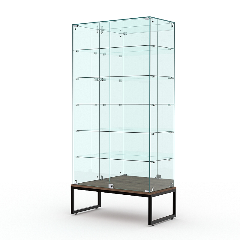 Торговая стеклянная витрина на металлическом основании из сварной профильной трубы 25х25мм, покрытой порошковой краской украсит интерьер книжного, художественного, парфюмерного магазина.