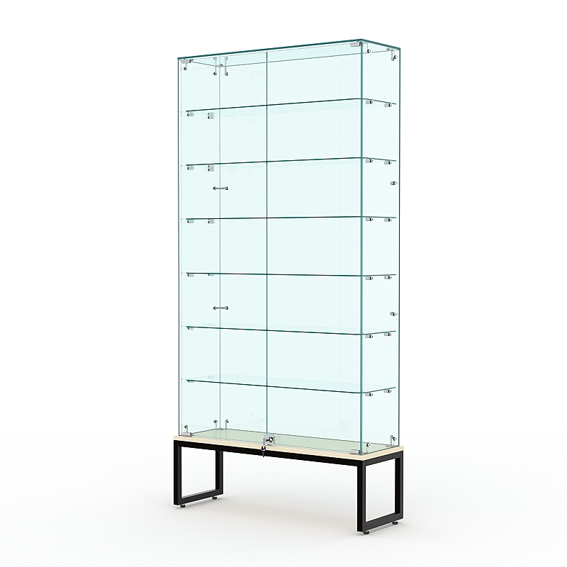 Торговая стеклянная витрина на металлическом основании из сварной профильной трубы 25х25мм, покрытой порошковой краской украсит интерьер книжного, художественного, парфюмерного магазина.