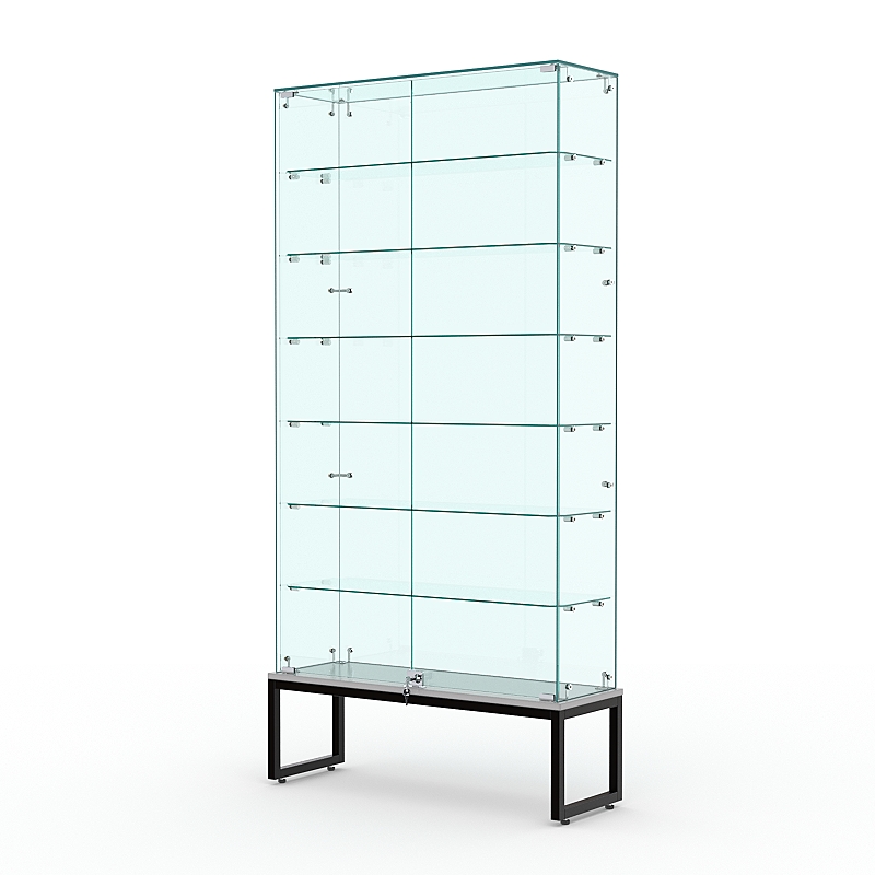 Торговая стеклянная витрина на металлическом основании из сварной профильной трубы 25х25мм, покрытой порошковой краской украсит интерьер книжного, художественного, парфюмерного магазина.