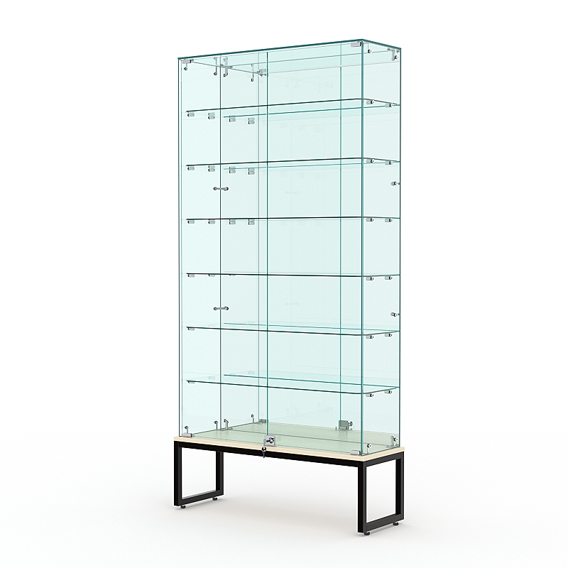 Торговая стеклянная витрина на металлическом основании из сварной профильной трубы 25х25мм, покрытой порошковой краской украсит интерьер книжного, художественного, парфюмерного магазина.