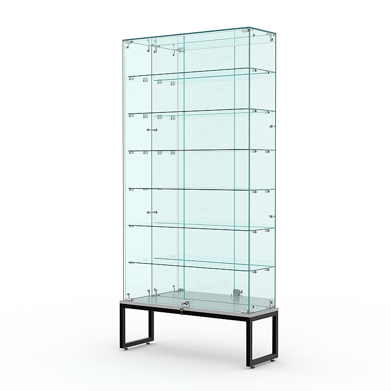 Торговая стеклянная витрина на металлическом основании из сварной профильной трубы 25х25мм, покрытой порошковой краской украсит интерьер книжного, художественного, парфюмерного магазина.