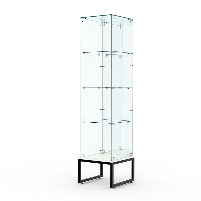 Торговая стеклянная витрина на металлическом основании из сварной профильной трубы 25х25мм, покрытой порошковой краской украсит интерьер книжного, художественного, парфюмерного магазина.