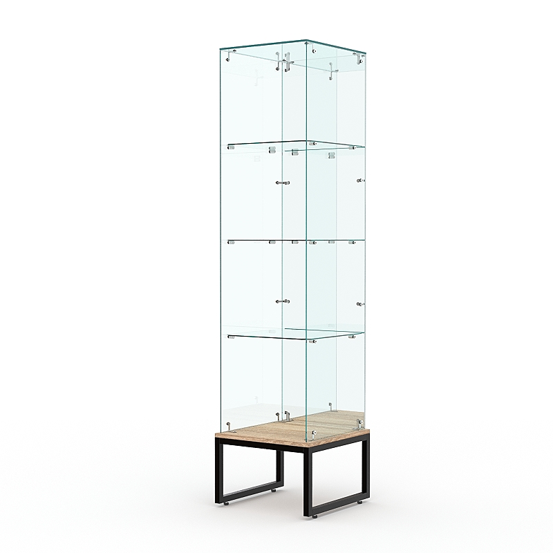 Торговая стеклянная витрина на металлическом основании из сварной профильной трубы 25х25мм, покрытой порошковой краской украсит интерьер книжного, художественного, парфюмерного магазина.