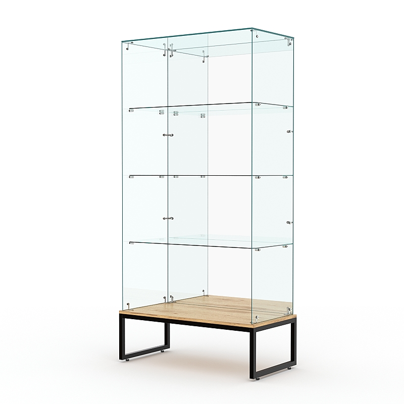Витрины стеклянные серии «ЛОФТ СТИЛЬ ПОДИУМ» представляют собой отличный вариант недорогих витрин с абсолютно прозрачными боковыми стенками, задняя стенка — зеркало . Витрина расположена на металическом основании из сварной профильной трубы 25х25мм, покрытой порошковой краской.