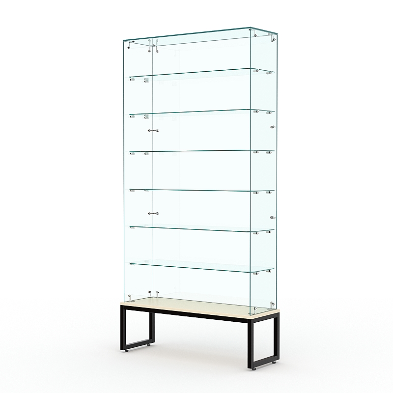 Торговая стеклянная витрина на металлическом основании из сварной профильной трубы 25х25мм, покрытой порошковой краской украсит интерьер книжного, художественного, парфюмерного магазина.
