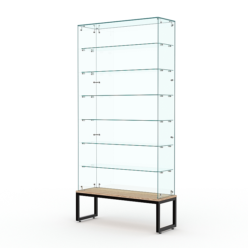 Торговая стеклянная витрина на металлическом основании из сварной профильной трубы 25х25мм, покрытой порошковой краской украсит интерьер книжного, художественного, парфюмерного магазина.