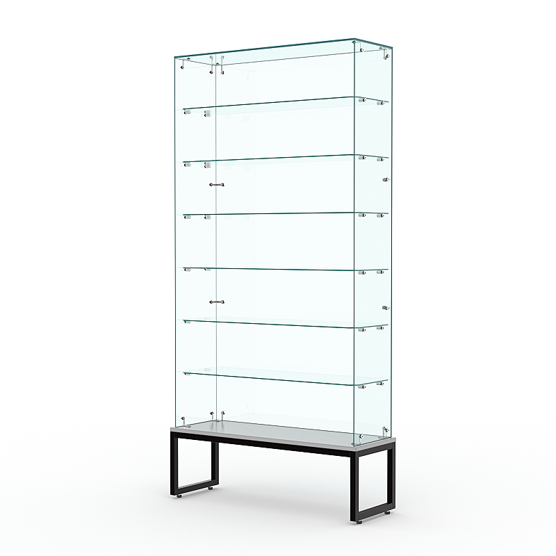Торговая стеклянная витрина на металлическом основании из сварной профильной трубы 25х25мм, покрытой порошковой краской украсит интерьер книжного, художественного, парфюмерного магазина.