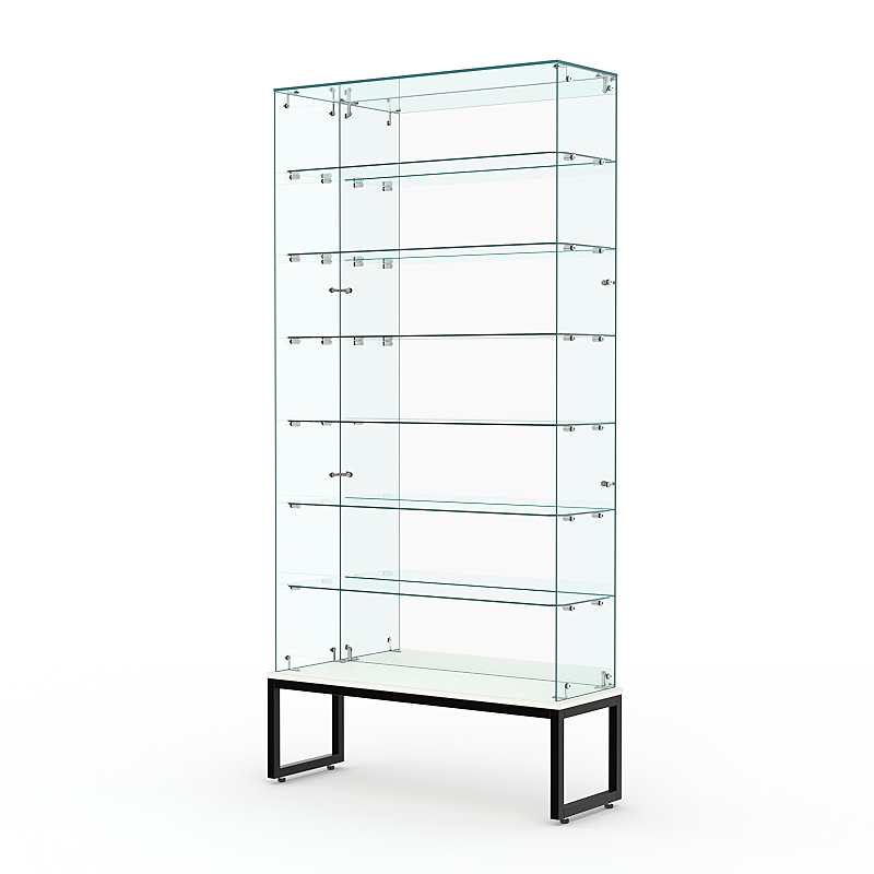 Торговая стеклянная витрина на металлическом основании из сварной профильной трубы 25х25мм, покрытой порошковой краской украсит интерьер книжного, художественного, парфюмерного магазина.
