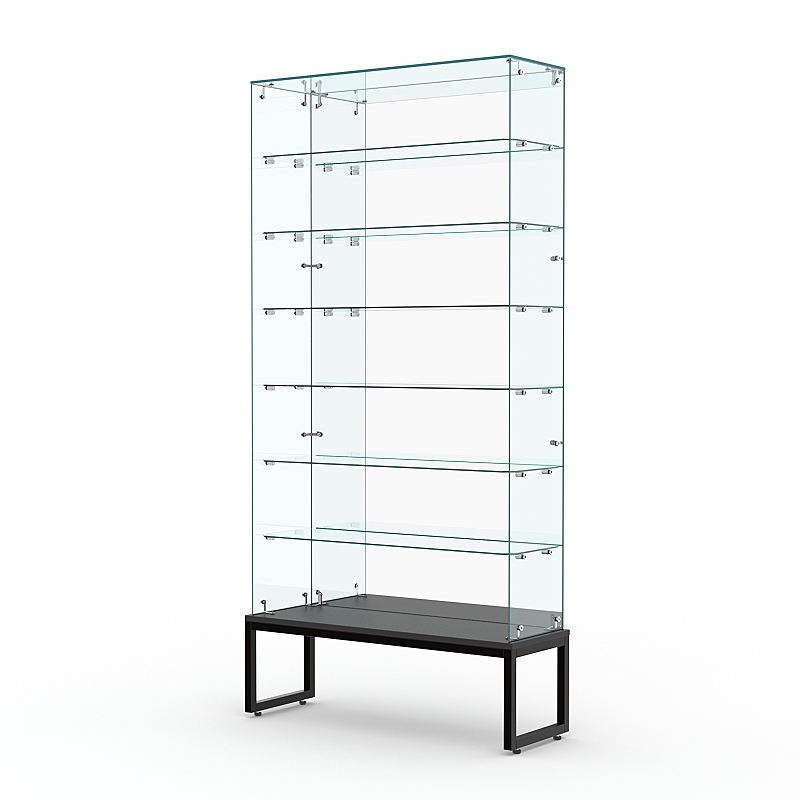 Торговая стеклянная витрина на металлическом основании из сварной профильной трубы 25х25мм, покрытой порошковой краской украсит интерьер книжного, художественного, парфюмерного магазина.
