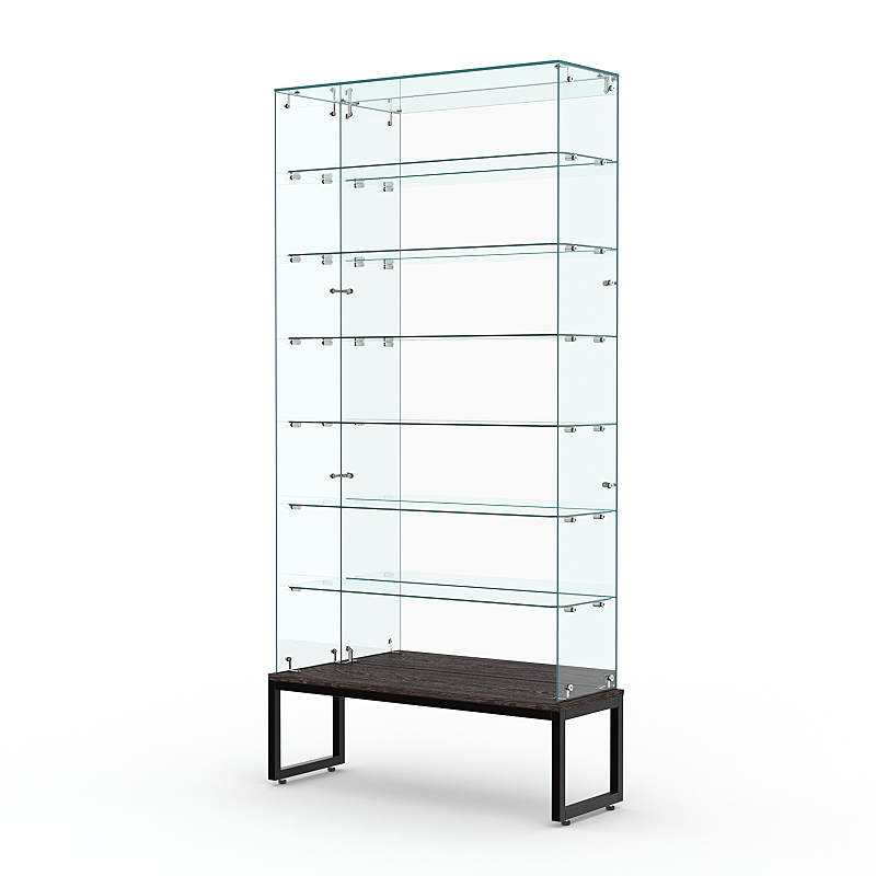 Торговая стеклянная витрина на металлическом основании из сварной профильной трубы 25х25мм, покрытой порошковой краской украсит интерьер книжного, художественного, парфюмерного магазина.
