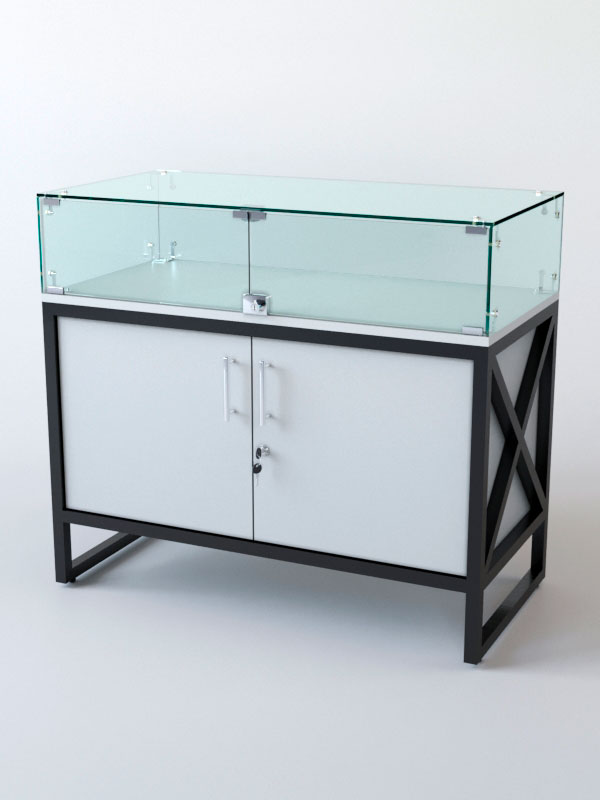 Торговый прилавок. Верхняя часть стеклянная, которая придает прилавку эстетичный вид и увеличивают его функциональность. Стекло позволяет демонстрировать товары, не закрывая их от покупателей, и создаёт ощущение лёгкости и воздушности конструкции. Основание из стекла делает прилавок устойчивым и надёжным, а также облегчает уборку поверхности.