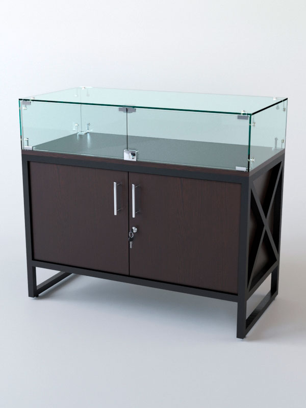 Торговый прилавок. Верхняя часть стеклянная, которая придает прилавку эстетичный вид и увеличивают его функциональность. Стекло позволяет демонстрировать товары, не закрывая их от покупателей, и создаёт ощущение лёгкости и воздушности конструкции. Основание из стекла делает прилавок устойчивым и надёжным, а также облегчает уборку поверхности.