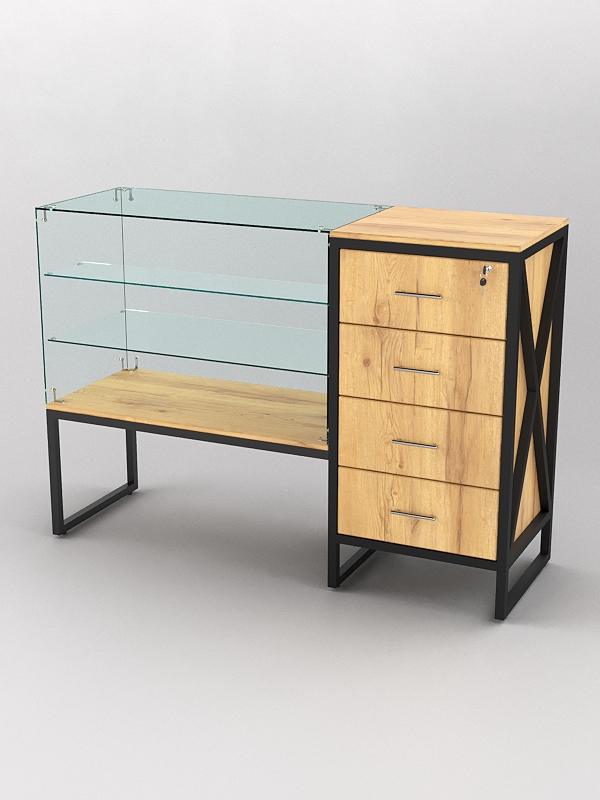 Верхняя часть стеклянная и оснащена стеклянными полками. Стеклянные полки на прилавках служат для демонстрации товаров. Они позволяют покупателям видеть товар, не прикасаясь к нему, что обеспечивает его сохранность и презентабельный вид. Кроме того, стеклянные полки придают прилавку более элегантный вид и делают его более функциональным. Прилавок со стеклянными полками может быть полезен в магазинах, где необходимо демонстрировать товары. Например, это могут быть магазины ювелирных изделий, часов, аксессуаров, а также магазины косметики и парфюмерии.