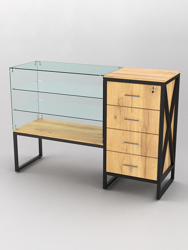 Верхняя часть стеклянная и оснащена двумя стеклянными полками. Стеклянные полки на прилавках служат для демонстрации товаров. Они позволяют покупателям видеть товар, не прикасаясь к нему, что обеспечивает его сохранность и презентабельный вид. Кроме того, стеклянные полки придают прилавку более элегантный вид и делают его более функциональным. Прилавок со стеклянными полками может быть полезен в магазинах, где необходимо демонстрировать товары. Например, это могут быть магазины ювелирных изделий, часов, аксессуаров, а также магазины косметики и парфюмерии.