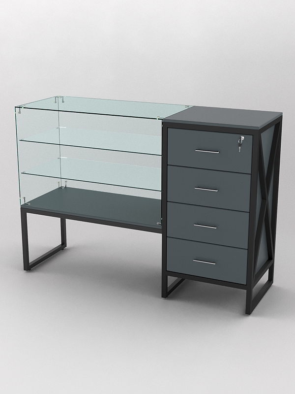 Верхняя часть стеклянная и оснащена двумя стеклянными полками. Стеклянные полки на прилавках служат для демонстрации товаров. Они позволяют покупателям видеть товар, не прикасаясь к нему, что обеспечивает его сохранность и презентабельный вид. Кроме того, стеклянные полки придают прилавку более элегантный вид и делают его более функциональным. Прилавок со стеклянными полками может быть полезен в магазинах, где необходимо демонстрировать товары. Например, это могут быть магазины ювелирных изделий, часов, аксессуаров, а также магазины косметики и парфюмерии.